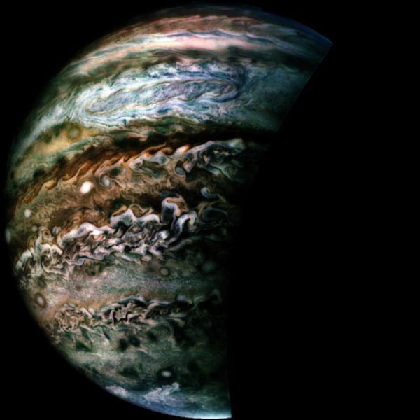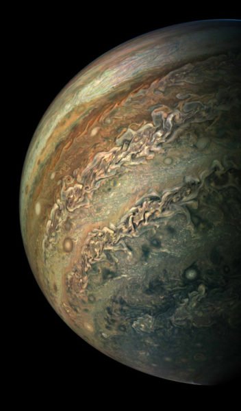 As maravilhas visuais não existem apenas na superfície do planeta Terra. Indo mais além, mas sempre no interior do Sistema Solar, chegamos ao gigante gasoso Júpiter. O último peri-Júpiter efetuado pela sonda Juno (o momento de máxima aproximação orbital a esse planeta) ocorreu no dia 1o de setembro e possibilitou a obtenção de fotografias de rara beleza. Algumas delas podem ser vistas na galeria abaixo.