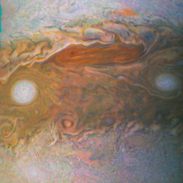 Os olhos dos furacões: duas das grandes manchas brancas de Júpiter. Em julho 2017, Juno enviou imagens em grande proximidade da Grande Mancha Vermelha, uma tempestade com diâmetro de 16.350 quilômetros que se manifesta ininterruptamente no planeta há pelo menos 350 anos.