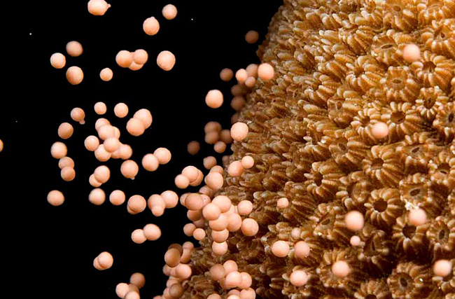 Detalhe de banco de corais liberando óvulos que serão fertilizados em seguida