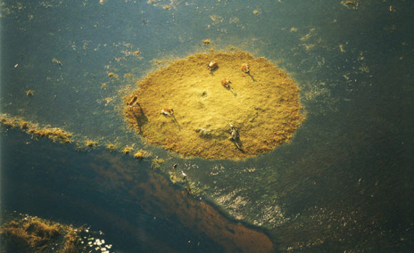 3 Delta do rio Okavango. Alguns animais como antílopes de áreas pantanosas, e um crocodilo, descansam sobre uma ilhota no delta do rio Okavango (Botsuana): o rio termina no deserto do Kalahari e cria um ecossistema úmido riquíssimo de vida animal e vegetal. Ele poderá desaparecer completamente por causa da prevista diminuição das chuvas sazonais.