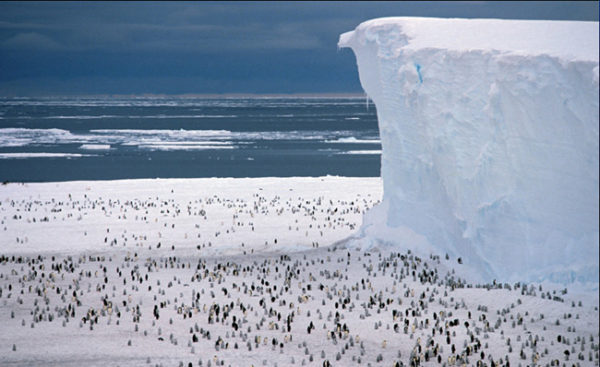 11 Falésia de gelo na Antártica. Ao redor dela, uma colônia de pinguins imperador com seus filhotes: uma imagem que simboliza a Antártica. Mas tudo isso está ameaçado. Segundo um relatório do Scientific Committee on Antarctic Research, em 2100 a temperatura média na região poderá estar 3 graus centígrados mais alta, e nesse caso a área da banquisa (o gelo que se forma sobre o mar) ao redor da Antártica diminuiria em 33%. Isso seria terrível para os organismos que vivem e se nutrem nesse ambiente, inclusive os pinguins imperador. Todos correm o risco de serem dizimados pelo aquecimento global.