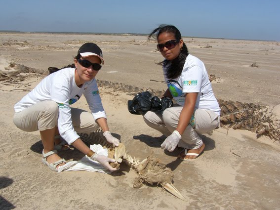 A bióloga Alexandra Fernandes Costa é coordenadora técnica do Procema. Com larga experiência na Amazônia, onde passou dois anos pesquisando cetáceos e sirênios da região, é ela quem agora orienta os trabalhos de campo dos biólogos do Procema. Delicada e inteligente, tem um surpreendente cuidado ao dissecar os corpos de golfinhos mortos que terminam nas praias do litoral do delta do rio Parnaíba. “Ainda na faculdade, entrei para um grupo que estudava cetáceos. Era um bando de estudantes que gostavam de surfar, e os botos muitas vezes surfavam com eles”, conta Alexandra, enquanto secciona a coluna vertebral de um boto-tucuxi.
