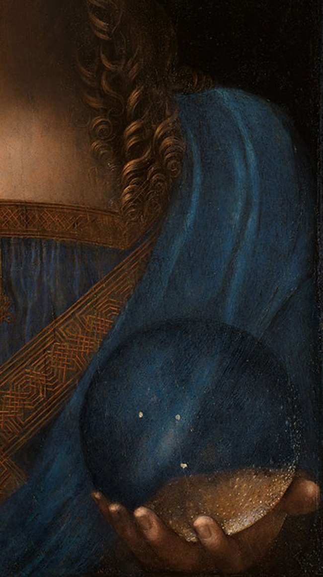 O enigmático Salvador do Mundo. O Cristo de Da Vinci se apresenta em visão frontal, a mão direita levantada em gesto de benção, mas não existe auréola ao redor da cabeça. O único elemento divino do retrato é o globo de cristal na mão esquerda, símbolo do poder sobre o universo, e também símbolo do interesse científico de Leonardo. O globo, com efeito, é certamente um cristal de quartzo transparente polido (é evidente o estudo ótico da pintura). Esses objetos, conhecidos como “bolas de cristal”, são desde sempre elementos do interesse dos estudiosos de esoterismo, talvez por causa das suas curiosas propriedades elétricas.