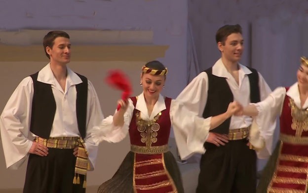 Diferente do Balé Bolshoi, que é quase que exclusivamente erudito, o Balé Moiseyev gosta de enveredar pelos repertórios populares do seu país, a Rússia, e também os de outras nacionalidades. Aqui, o seu corpo de bailarinos executa uma bela coreografia do sirtaki, a mais conhecida das danças tradicionais da Grécia.