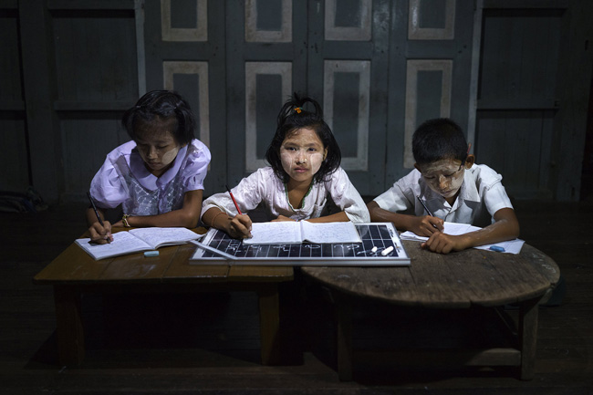 Estudantes fazem suas lições de casa pós-escola em um centro comunitário alimentado por energia solar em Yangon, Mianmar. Estudos mostram o papel essencial da eletricidade na promoção da alfabetização e na melhoria da qualidade da educação. Em 2017, apenas 27% das escolas do país tinham eletricidade.