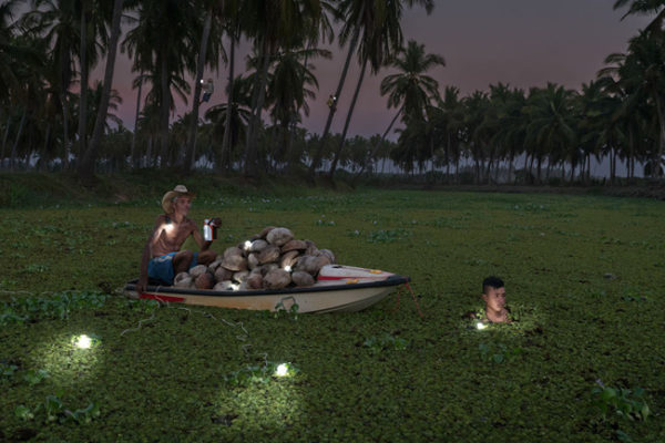 Cristóbal Céspedes Lorenzo e seu jovem sócio, Francisco Manzanares Cagua, carregam cocos recém-colhidos pelo rio até Copala, no México, que serão vendidos à uma empresa que produz manteiga e óleo de coco.
