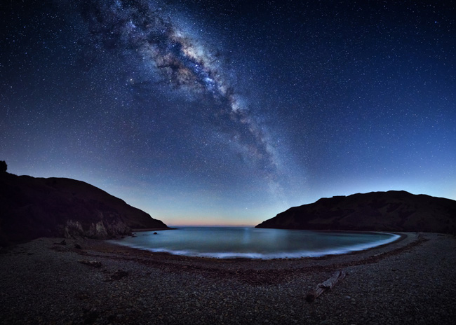 A Via Láctea se alonga, refletida nas águas da Cable Bay, na Nova Zelândia. A imagem panorâmica foi obtida a partir da superposição de 42 tomadas diversas. O fotógrafo procurou trabalhar antes que a luz do dia, que se entrevê à distância, inundasse totalmente a paisagem. Fotógrafo: Mark Gee.