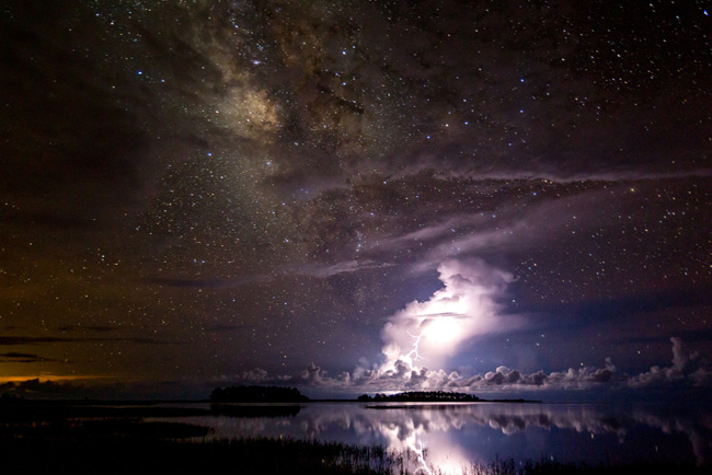 A Via Láctea se destaca sobre um temporal nos céus da Flórida. Nessa imagem, o fotógrafo quis colher o contraste entre a “imobilidade” da galáxia e as luzes em contínua transformação de um fenômeno meteorológico terrestre. Fotógrafo: Tianyuan Xiao.