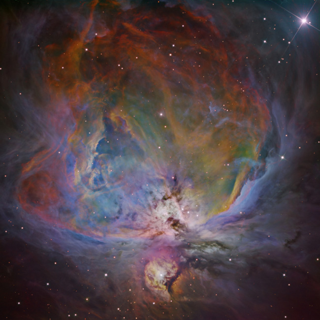 Uma foto clássica da fotografia astronômica: a nebulosa de Orion (M42), situada a 1500 anos luz de nós, é a protagonista desta imagem resultante de 36 horas de exposição com o uso de seis filtros diversos. Fotógrafo: Bernard Miller.
