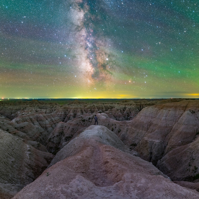 Ficamos indecisos sobre o que admirar mais, se a Via Láctea e as cores do céu do plano de fundo da foto, ou os rochedos do Badlands National Park, no Dakota do Sul. Fotógrafo: Jingpeng Liu.