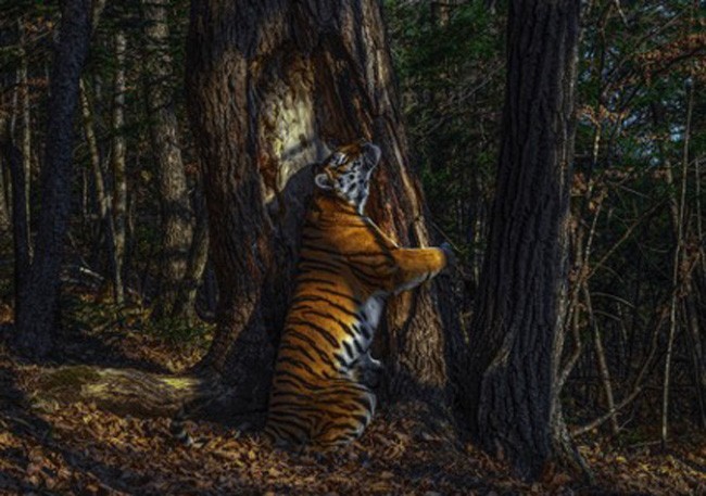 1 O abraço da tigresa. Vencedor Absoluto na categoria Animais em seu Ambiente: Uma tigresa abraça um antigo pinheiro da Manchúria, esfregando sua bochecha contra a casca para deixar secreções de suas glândulas odoríferas. Ela é uma tigresa da variedade Amur, também chamada de tigre siberiano (Panthera tigres altaica), moradora do Parque Nacional Leopardo, na Sibéria russa. Caçada quase até a extinção ao longo do século 20, a população da espécie está hoje reduzida a 500/600 indivíduos, e continua ameaçada pela caça ilegal e pela extração ilegais de madeira. Essa destruição do meio ambiente afeta também as presas desses tigres – principalmente veados e javalis. Foto: Sergey Gorshkov