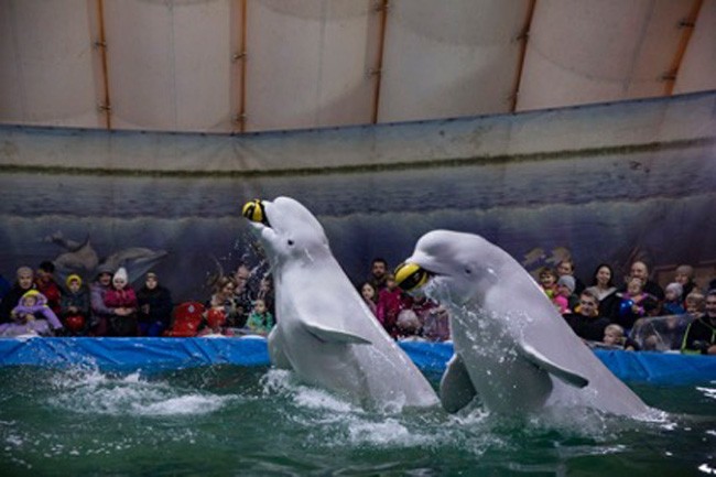 10 Futebol de belugas. Vencedor na categoria Fotojornalismo de vida selvagem. Essas duas belugas estão se apresentando em uma piscina inflável dentro de uma tenda de circo em um estacionamento. Elas pertencem a um delfinário viajante, um dos 12 que hoje viajam pela Rússia. As belugas fazem as mesmas performances muitas vezes ao dia. Quando o show termina, elas são colocadas de volta em tanques e içadas em um caminhão para serem levadas para a próxima cidade. Essas duas baleias foram capturadas em águas russas. Elas agora vivem em pequenos tanques de água salgada e são transportadas de cidade em cidade, provavelmente até morrerem. Não há leis na Rússia que regulem especificamente o tratamento de mamíferos marinhos em cativeiro e, em 2020, as belugas ainda poderiam ser capturadas legalmente para fins científicos e educacionais. O objetivo educacional deste show é trazer animais nativos para o público russo. Foto: Kirsten Luce.