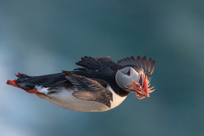 12 Entrega atrasada. Categoria Comportamento de Aves. Com um bico cheio de krill, um papagaio-do-mar do Atlântico vem pousar na Ilha Grimsey, no norte da Islândia. A maior parte da colônia já havia se acomodado para a noite, e Catherine Dobbins d’Alessio rastreou o papagaio-do-mar enquanto ele circulava com o vento, iluminado pelo sol da tarde, dando-lhe uma olhada enquanto passava. A comida era para seu filhote, escondido em uma toca na encosta do penhasco. Foto: Catherine Dobbins d’Alessio.