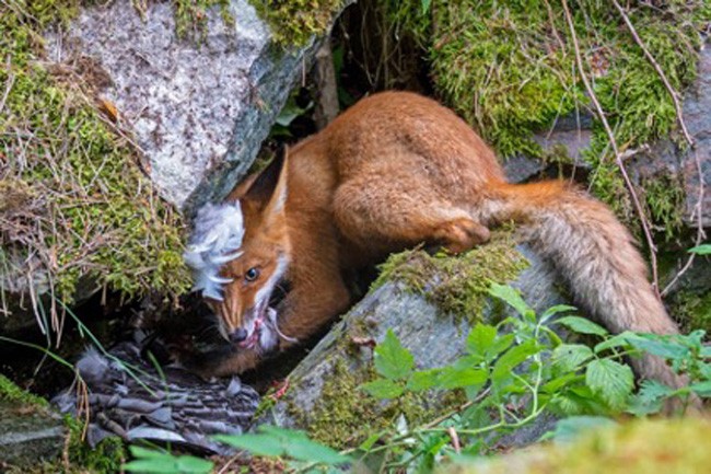 13 E a raposa pegou o ganso. Vencedor na categoria 15-17 anos. Foi durante um feriado de verão em Helsinque que Liina Heikkinen, então com 13 anos, ouviu falar de uma grande família de raposas que vivia nos subúrbios da cidade na ilha finlandesa de Lehtisaari. A ilha tem áreas arborizadas e moradores que gostam das raposas, e assim, as raposas não têm medo de humanos. Heikkinen e seu pai passaram um longo dia de julho, sem se esconder, observando os dois adultos e seus seis grandes filhotes, que eram quase do tamanho de seus pais, embora mais magros e esguios. Em outro mês, os filhotes seriam capazes de se defender sozinhos, mas em julho eles estavam pegando apenas insetos, minhocas e alguns roedores, e os pais ainda traziam presas maiores para eles. Nesta noite, a raposa chegou com um ganso-craca. As penas voaram quando os filhotes começaram a lutar por ela. Um finalmente ganhou posse – urinando nele de excitação. Arrastando o ganso para uma fenda, o filhote tentou comer seu prêmio enquanto bloqueava o acesso aos outros. Foto: Liina Heikkinen.