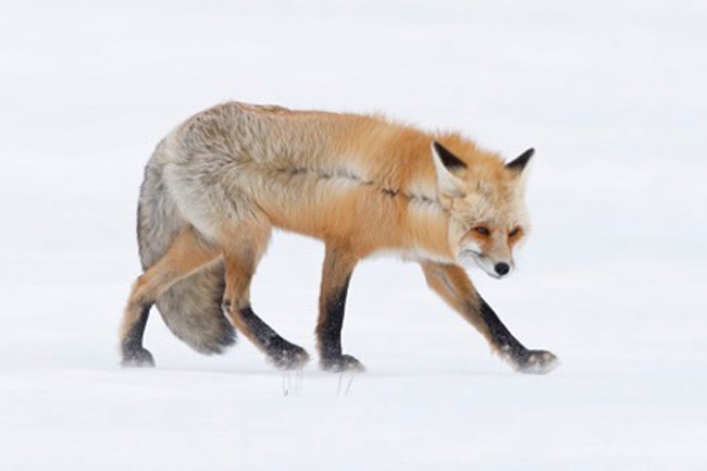 3 Uma raposa para todas as estações. Retratos de animais altamente recomendados: Enquanto caça ao longo do vale coberto de neve, uma raposa vermelha americana é atingida lateralmente por uma rajada de vento, que abre seu casaco de inverno espesso para revelar a camada de pelos finos. Implacável, esse exemplar macho continuou ouvindo atentamente à qualquer som de uma ratazana ou rato correndo sob a neve. Foto obtida em uma tarde gelada de fevereiro no Parque Nacional de Yellowstone, em Wyoming. O fotógrafo observou a raposa durante horas, resistindo ao vento e às quedas repentinas de temperatura para obter esta imagem nítida de um sobrevivente do inverno. Foto: John Blumenkamp.