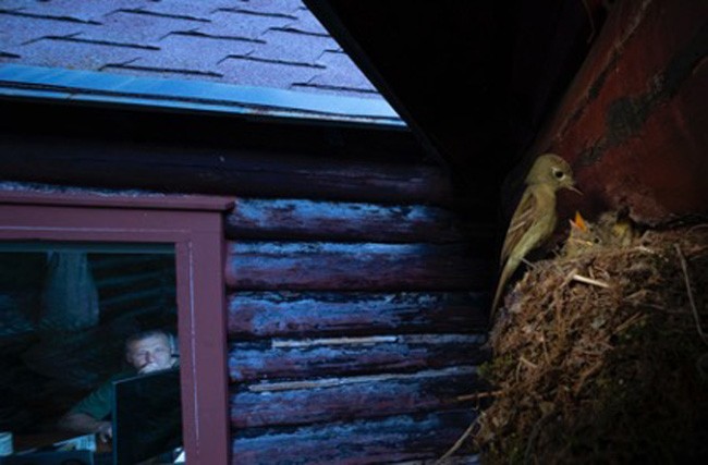 5 Eu te assisto assistir. Vencedor na categoria Vida Selvagem Urbana. Que regalo para um biólogo: a espécie que você deseja estudar escolhe fazer o ninho bem em frente à sua janela. A população do papa-moscas da Cordilheira está diminuindo em todo o oeste da América do Norte à medida que as mudanças climáticas causam o encolhimento dos habitats ribeirinhos (ou seja, rios e outros corredores de água doce) ao longo de suas rotas migratórias e em suas áreas de inverno no México. Ele normalmente nidifica em fendas e prateleiras nos desfiladeiros das Montanhas Rochosas de Montana. Mas em vez disso um casal escolheu essa cabana pesquisas construída em local remoto, talvez para evitar predação. O ninho foi construído sobre o batente superior de uma janela pela fêmea. Ambos os pais alimentaram os filhotes, voando para pegar insetos no ar ou pairando para pegá-los nas folhas. Para não perturbar os pássaros ou atrair predadores para o ninho, Alex Badyaev escondeu sua câmera atrás de um grande pedaço de casca de um antigo abeto encostado na cabana. Ele operou a a câmera remotamente da cabine. Foto: Alex Badyaev.