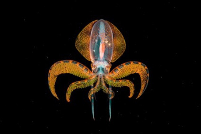 7 Um instante dourado. Vencedor na categoria Subaquático. Uma minúscula larva de lula flutua na escuridão das profundezas. Quando foi atingida por um peixe de luz, ele produziu essa cor ouro cintilante e, logo em seguida, se moveu para longe do feixe de luz. O feixe de luz era acionado por Songda Cai, mergulhador de águas profundas, no litoral de Anilao, nas Filipinas. Foto: Songda Cai.