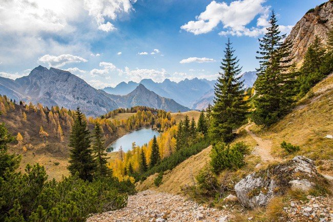Paisagem do lago alpino Bordaglia (Udine, Itália).