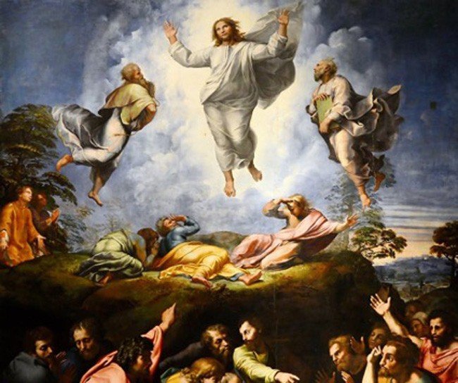 Na pintura A Transfiguração de Jesus, de Rafael, Jesus surge louro e radiando luz no alto de uma montanha.