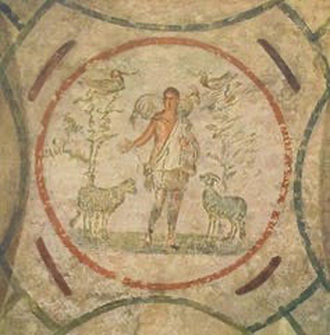 Até mesmos esses textos são contraditórios: Isaías, o profeta do Antigo Testamento, diz que o futuro salvador “não teria beleza nem majestade”, enquanto o Livro dos Salmos afirma que ele era “mais justo do que os filhos dos homens”, a palavra “justo” aqui significando beleza física. As primeiras imagens de Jesus Cristo surgiram entre o primeiro e o terceiro século d.C., em meio a preocupações com a idolatria. Os primeiros retratistas cristãos estavam menos interessados em capturar a aparência real de Cristo do que em esclarecer seu papel como governante ou salvador. Para indicar claramente esses papéis, aqueles primeiros artistas cristãos costumavam confiar no sincretismo, o que significa que combinavam formatos visuais de outras culturas. Provavelmente a imagem sincrética mais popular é a de Cristo como o Bom Pastor, uma figura jovem e sem barba, bastante baseada nas representações pagãs de deuses e heróis como Orfeu, Hermes e Apolo.