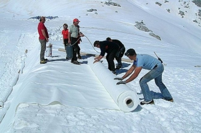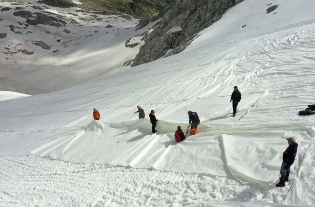 O projeto começou em 2008, quando foram cobertos quase 30 mil metros quadrados de gelo com lona térmica. Este ano, sua equipe está instalando 100 mil metros quadrados da proteção. “A tela é uma lona de geotêxtil que reflete a luz [do sol]”, diz, “e ajuda a preservar a neve”.