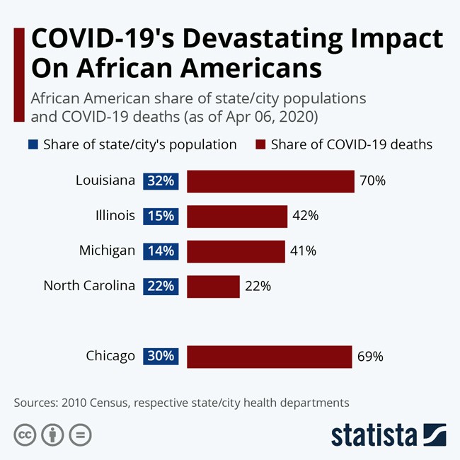 Analisando os cerca de 14 mil motos nos Estados Unidos, um dado salta aos olhos: em diversos estados e cidades a maior parte das vítimas fatais são de etnia afro-americana. Em Chicago, por exemplo, 69% dos mortos são de pele negra. Essas porcentagens são inesperadas, considerando-se que apenas 30% da população dessa cidade pertence a essa etnia. Também na Louisiana mais de 7 mortos de cada dez também são afro-americanos (e estes últimos representam apenas 32% da população total do estado). No condado de Milwaukee, onde os cidadãos negros constituem 27% da população, os afro-americanos vítimas da CoViD19 são 81% do total!
