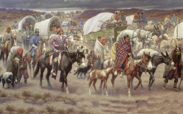 American Progress (pintura de John Gast, feita em 1872). Retrata a conquista do Oeste. Na pintura, vê-se o avanço dos colonos, da direita para a esquerda, significando a progressiva tomada de posse dos territórios do Atlântico ao Pacífico. Frente às carroças e diligências, a ferrovia, os agricultores e os caçadores que avançam, fogem os bisões, os indígenas nativos, os lobos. O progresso é inexorável, inevitável, guiado pela virtude e pela convicção de agir em nome de Deus. A pintura está hoje na Biblioteca do Congresso dos Estados Unidos.