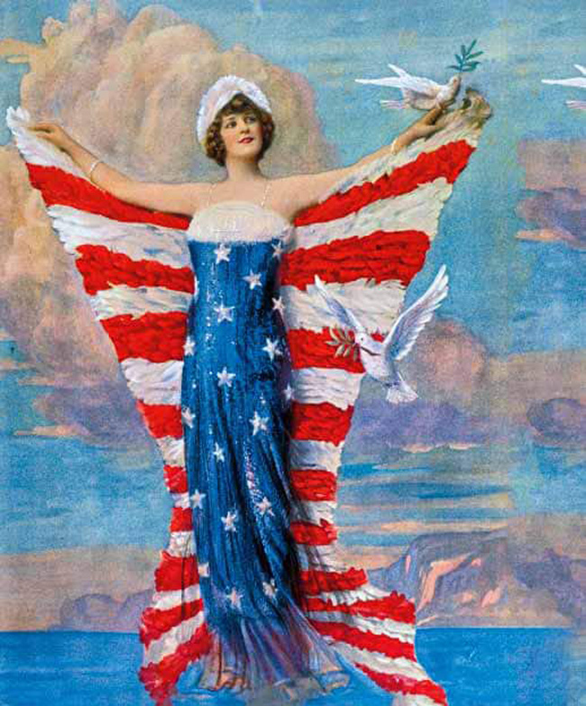Como os cruzados medievais, os americanos justificaram os massacres que perpetraram como “missões divinas”. Na foto, a atriz Hazel Down (1891-1988) posa vestida com a bandeira americana.