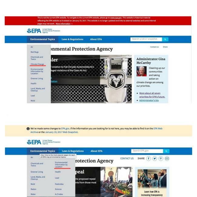 As mudanças mais drásticas e volumosas nas páginas da EPA foram feitas um dia antes da People’s Climate March (abril de 2017): desde então, na página principal do site para a proteção do meio ambiente falta a referência (o link) a uma página dedicada ao tema das mudanças climáticas. Nem todos os documentos foram removidos, mas encontra-los agora tornou-se uma tarefa difícil e cansativa. Torna-se necessário saber exatamente o que se está buscando para localizar o documento.