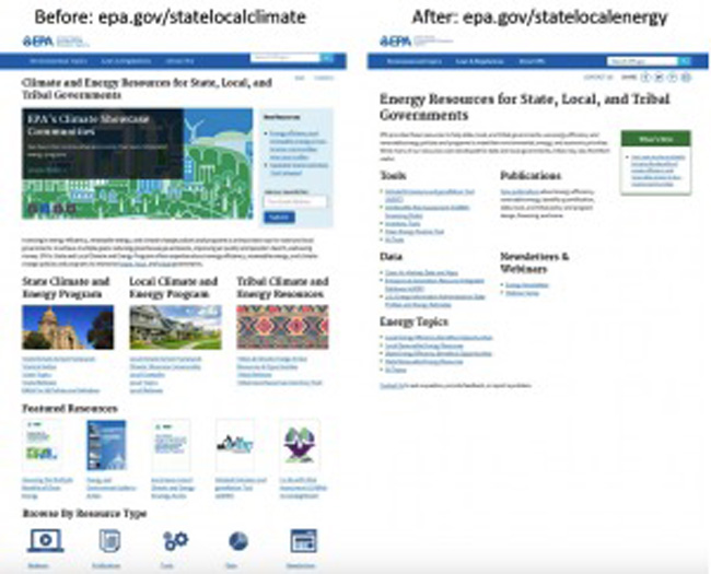 Algumas páginas foram completamente removidas, como é o caso da área dedicada aos estudantes. Uma outra importante seção foi completamente desfigurada: a “Climate and Energy Resources for State, Local and Tribal Governments”, que na sua nova versão perdeu o “Climate” junto a um número gigantesco de documentos e de dados científicos.