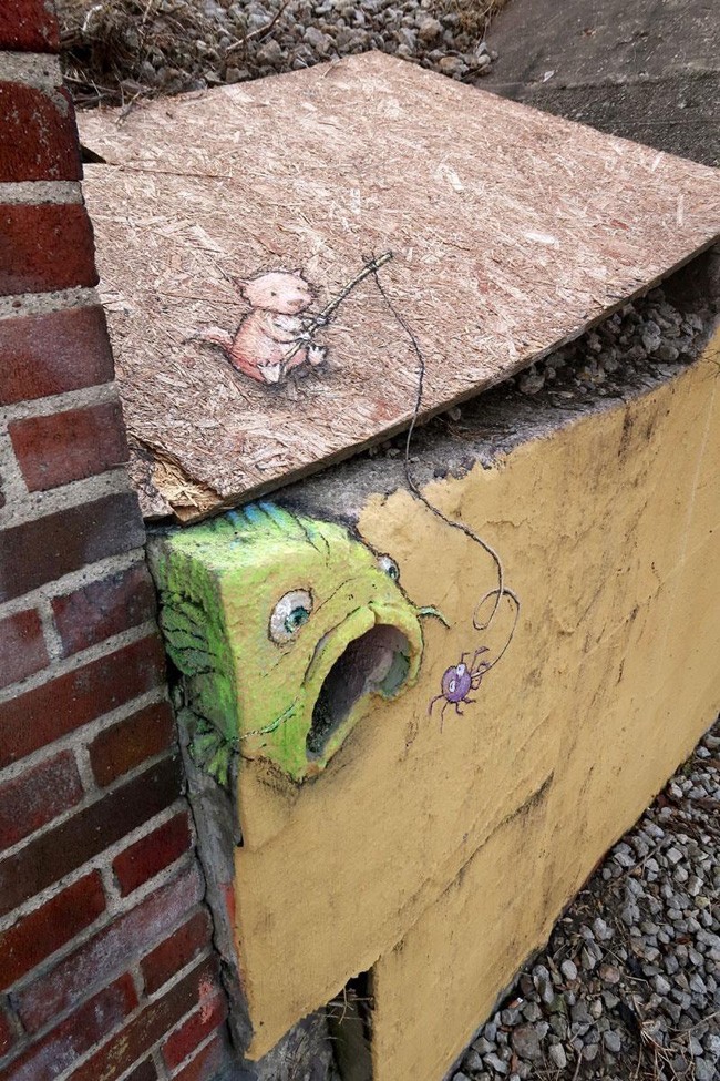 David Zinn é um artista de Ann Arbor, no Michigan, conhecido por sua “arte efêmera”, criada nas ruas e composta inteiramente de giz, carvão e objetos encontrados nos locais. Rachaduras, buracos, pequenas ranhuras já bastam para que Zinn perceba as figuras que eles sugerem e que ele completa com seu traço preciso de giz.