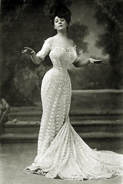 Em 1910, cinturinhas de vespa – Na primeira década do século 20 a silhueta dominante foi a das Gibson Girls: Penteados sofisticados, cintura de vespa, elegância natural e uma sólida educação dos modos e atitudes. O primeiro ideal de beleza feminina do século foi lançado pelo ilustrador norte-americano Charles Dana Gibson (1867-1944) que trabalhou para as mais importantes revistas dos Estados Unidos, como a Life e a Harper’s Weekly). A atriz teatral e modelo belga Camille Clifford (na foto), o encarnou perfeitamente.