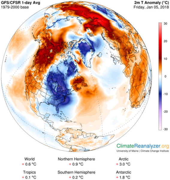A verdade é que, ao mesmo tempo em que um frio de rachar congela Nova York e outras cidades do leste norte-americano, em muitas outras partes do mundo, no Alasca e na Sibéria inclusive, as temperaturas são certamente mais elevadas. Nas zonas árticas, em particular, estão-se registrando temperaturas de cerca 3,4 graus centígrados superiores à média. No geral, o ano de 2017 está sendo considerado o mais quente já verificado de todos os anos em que não ocorre o fenômeno El Niño, desde que as temperaturas médias mundiais começaram a ser medidas, em 1850.