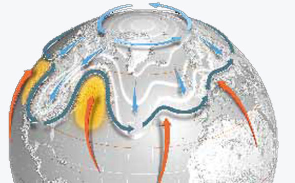 O vórtice polar se torna mais fraco (o círculo azul) e permite que o ar ártico corra para o sul. Também as correntes de jato (as ondas azuis) se tornam menos intensas deixando que o ar mais quente (setas vermelhas) suba para as áreas mais ao norte. O ar polar, denso e frio, penetra ao sul e permanece bloqueado sobre os Estados Unidos. O ar mais quente sobe e fica bloqueado sobre a Europa.