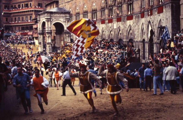 O Pálio de Siena, corrida equestre de origens medievais, mostra a disputa entre os diferentes bairros da cidade – cada um deles representado não pelo cavaleiro, e sim pelo cavalo.