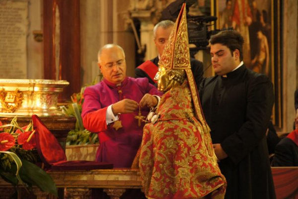 A imagem de San Gennaro, padroeiro de Nápoles, é preparada para a grande festa católica em homenagem ao santo.