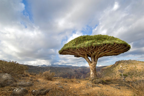 Árvore Sangue de Dragão (Socotra, Yemen). Essa planta, da família das agaváceas (Dracaena cinnabari), tem forma similar à de um guarda-chuva e é endêmica da ilha de Socotra, no Oceano Índico, um dos locais de maior biodiversidade da Terra. A sua copa achatada é uma adaptação às altas temperaturas e à escassa disponibilidade de recursos no solo. Essa conformação reduz a evaporação e protege com a sua sombra as sementes lançadas ao solo. A árvore produz uma resina de cor vermelha escura (o assim chamado “sangue de dragão”) quando os seus galhos são podados. Essa substância é usada como base para essências de perfumes e como pigmento colorante.