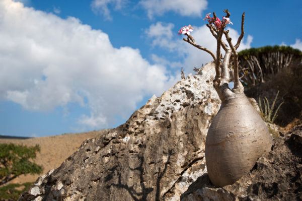 Árvore-garrafa (Socotra, Yemen). Na mesma ilha situada a cerca de 350 quilômetros do Iêmen, que hospeda mais de 800 variedades de plantas raras, 37% das quais podem ser encontradas em outras partes do mundo, encontra-se também a árvore-garrafa (Adenium obesum socotranum). Ela deve o seu nome à característica forma barriguda do seu tronco, que parece uma garrafa de vinho Chianti. Também neste caso a principal característica da planta – o tronco bulboso – é uma adaptação às altas temperaturas: líquidos e nutrientes são armazenados nessa base.