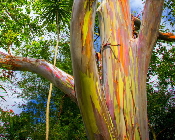 Eucalipto arco-íris (Havaí). A casca (córtex) do Eucalyptus deglupta, típico de algumas florestas tropicais da Austrália e do Havaí, é trocada várias vezes no decorrer do ano. Quando uma camada nova aparece, ela possui uma bela coloração verde forte; a seguir, a casca amadurece e se torna azulada, violácea, laranja e marrom, para depois se descolar e mostrar a camada que está por baixo. Essa contínua alternância produz no tronco desses eucaliptos um belo jogo de cores. Mas o conjunto só é bem vivo e brilhante quando a planta cresce no seu próprio habitat, um areal.