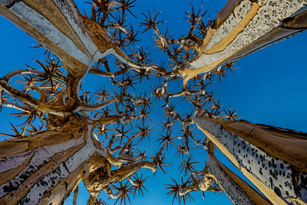 Árvore-aljava (Namíbia). Essa espécie de aloe (Aloe dichotoma) com folhas pontiagudas, típica da Namíbia e da África do Sul, toma o nome do costume dos bosquímanos de usar os seus ramos e as suas folhas para produzir aljavas para as flechas. A polpa dos troncos é retirada e usada para conter as armas, e também a comida. Sua madeira é porosa e mantém uma temperatura fresca em seu interior. Algumas espécies de pássaros também apreciam a forma pontiaguda das folhas, e nidificam entre esses ramos, que oferecem proteção contra predadores maiores que não conseguem atingir os ninhos.