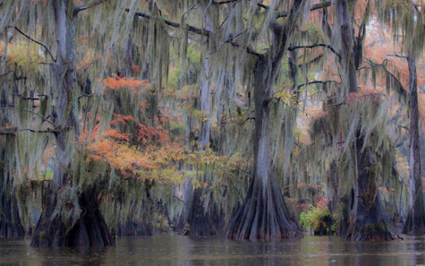 Ciprestes dos pântanos do Caddo Lake (Texas). Os ciprestes dos pântanos, coníferas de tronco maciço, com altura superior a 2 metros, crescem nas aguas lamacentas e pobres em oxigênio de rios, pântanos e lagoas dos Estados Unidos. Elas podem ser encontradas no Caddo Lake, uma zona lacustre e pantanosa na fronteira entre o Texas e a Louisiana. Formam ali paisagens estranhas e misteriosas.