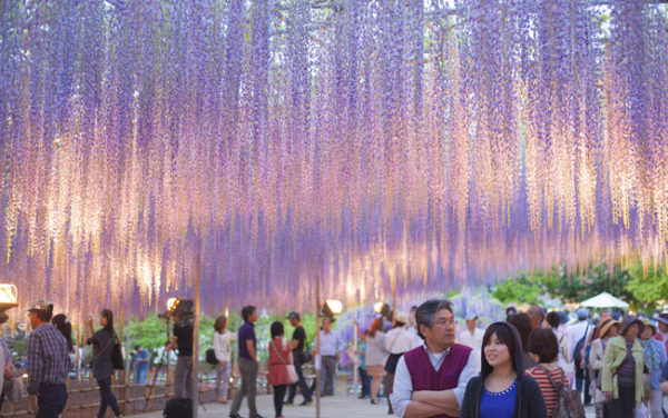 Glicínias japonesas. Entre o final de abril e o início de maio, as galerias de glicínias (gênero Wisteria) criam espetaculares cenários rosados no Japão. As glicínias não são árvores, e sim trepadeiras que crescem e se expandem num espaço que supera os 10 metros de amplitude e 20 metros de altura. As floradas colorem de rosa ou de lilás as estruturas dos túneis criados para sustentá-las.