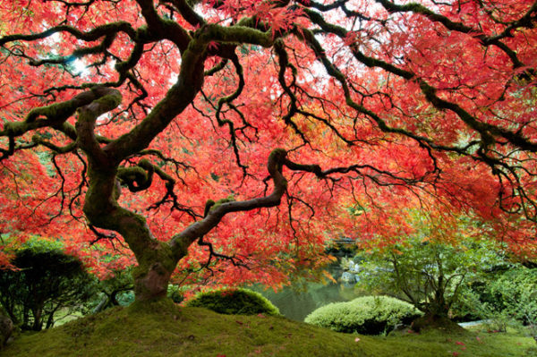 O bordo-japonês (Acer palmatum). Uma das plantas que simbolizam o Japão, ela surpreende pela beleza dos seus ramos, “alérgicos” à poda, à qual reagem muito mal. Mas sobretudo pela cor vermelha acesa que, no outono, colore os jardins.