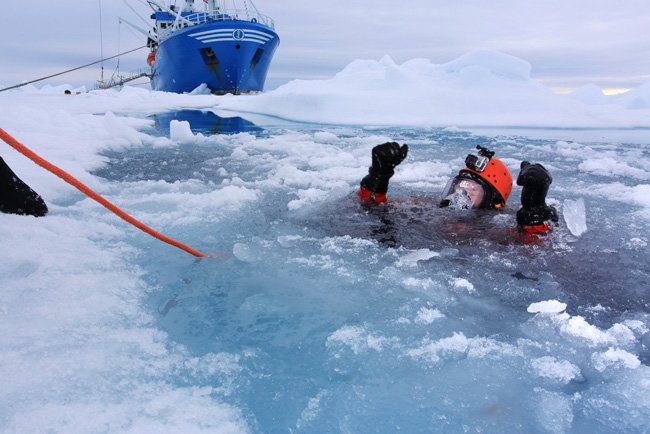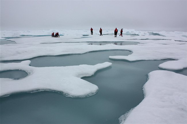 Explorador norueguês confere a diminuição da espessura da calota de gelo ártica.