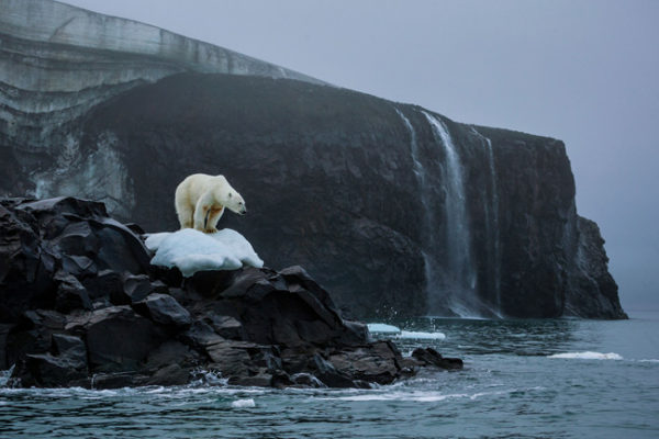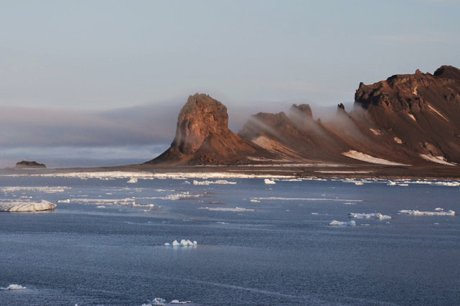 Cabo Tegetthoff na ilha de Gall, na Terra de Francisco José. Também esta área do Ártico se ressente do aumento da temperatura média da Terra: a retirada dos gelos é enorme.