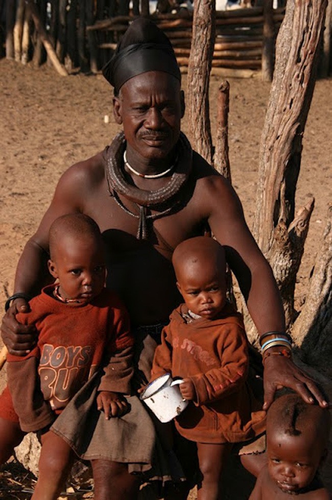 Chefe himba, pai “social” das crianças que aparecem na foto. As três podem ou não serem filhos biológicos dele.