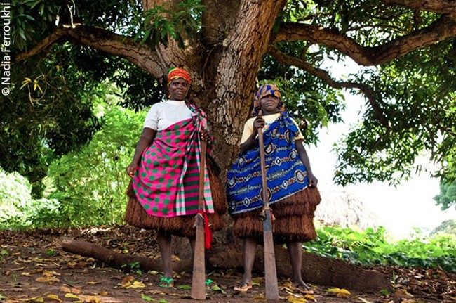 Na Guiné-Bissau, na África ocidental, o modo de vida nos arquipélagos, em especial na ilha de Canhabaque (população de 3,5 mil), praticamente foi pouco ou nada influenciado pela civilização moderna. Aqui, as casas são de propriedade das mulheres, e são os homens que se mudam para as casas de suas esposas. Embora o pai transmita o nome da família para os filhos, é a mãe que escolhe o primeiro nome deles – e é ao clã dela que eles estão relacionados. A ilha é governada por uma rainha. Há também um rei (que não é o marido da rainha), mas seu papel é limitado – ele é simplesmente um porta-voz. Cada vilarejo é governado por um conselho de mulheres, eleito para um mandato vitalício. Na foto, duas jovens defunto. Este é o nome dado às jovens que devem passar por todas as etapas da iniciação feminina, na ilha de Canhabaque, na Guiné-Bissau.