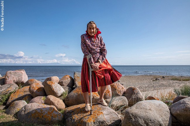 Atualmente, Kihnu, uma pequena ilha estoniana no Mar Báltico, tem cerca de 500 habitantes, em comparação aos 7 mil durante a era soviética. Tradicionalmente, quando os homens iam para o mar, as mulheres assumiam suas tarefas, como trabalhar nos campos. Desde meados do século 19, as mulheres de Kihnu assumiram o controle e passaram a administrar os assuntos da comunidade. Embora na atualidade os homens representem aproximadamente metade da população da ilha, ainda são suas mães, esposas e filhas as responsáveis pela educação, pela cultura, pela vida comunitária e pelas tradições artesanais. Nos guias turísticos, Kihnu é frequentemente chamada de “a Ilha das Mulheres”. No entanto, essa imagem simplista não é do agrado dos envolvidos. As mulheres reconhecem que desempenham um papel de liderança na tomada de decisões, mas em uma sociedade na qual a renda dos homens permanece como a base das finanças familiares. Na foto, a famosa cantora de folk Virve Köster (nascida em 1928) é a guardiã das tradições culturais seculares de Kihnu, que são expressas em música, dança e artesanato. Essas tradições foram inscritas na Lista Representativa do Patrimônio Cultural Imaterial da UNESCO em 2008.
