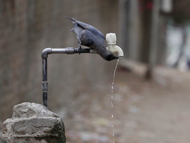 Corvo bebe água de uma torneira durante dia quente em Ahmadabad, na Índia, em foto de arquivo.