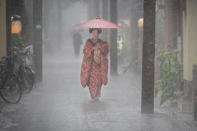 Uma gueixa em seu vestido tradicional, um quimono, caminha sob uma chuva forte no centro histórico de Quioto, Japão. Foto: Patrick Hochner.